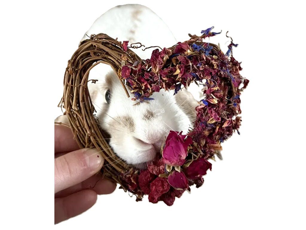 Proutěné srdíčko z vinné révy je přírodní hračka určená pro králíky a malé hlodavce. Slouží k okusování, zábavě i obohacení prostředí v kleci či výběhu. Kombinace sušených malin, poupat růže a bylin přirozeně láká ke zkoumání, podporuje přirozený okusovací instinkt a pomáhá zahnat nudu. Díky možnosti zavěšení je srdce snadno dostupné a zároveň podporuje aktivní pohyb zvířátka.