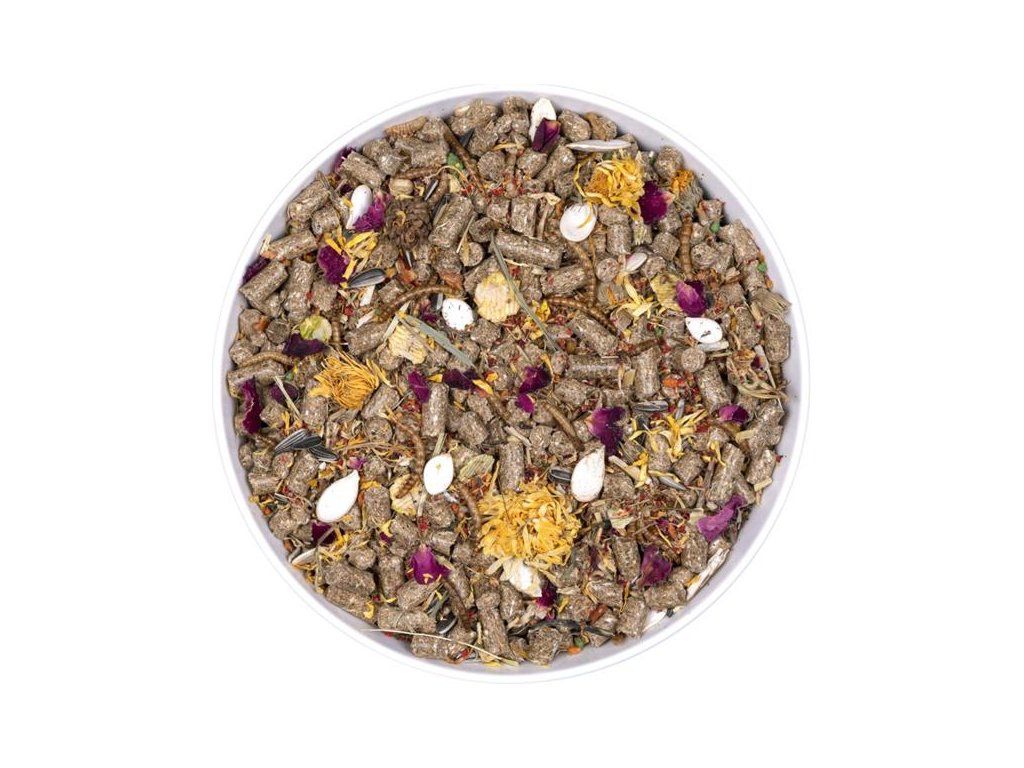 Ječmen (19 %), pšeničné otruby (17,2 %), pšenice, celé sójové boby, kukuřice (11,23 %), hrachové vločky obohacené vitamínem C, karobové lusky, mrkev (2,5 %), bílý oves, černý oves, špalda, řepná dužina (2 %), sójový olej, larvy potemníků (Tenebrio molitor – 1,4 %), uhličitan vápenatý, echinacea, slunečnicová semena žíhaná, dýňová semena, měsíček, okvětní lístky růží, lněné semeno, monokalcium fosfát, směs ovoce (0,5 %) (kokos, banán, jablko, pomeranč), semínka mastňáku, vaječný prášek (0,2 %), chlorid sodný, celá slunečnicová semena, pivovarské kvasnice (zdroj mannan-oligosacharidů, 0,12 %), dobromysl, agávový inulin, tymián, máta, skořice, kurkuma.
